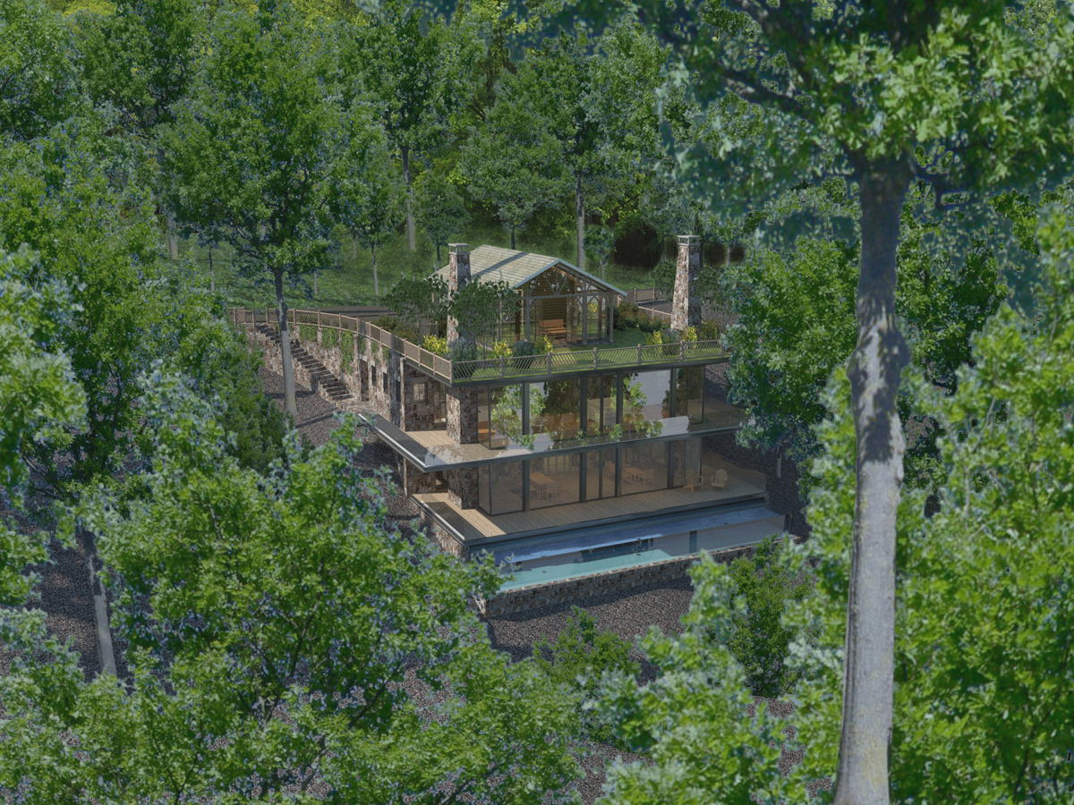 This project is located in a century-old community established as a summer retreat. Original cottages, averaging only 750 SF, were designed in the picturesque Adirondack rustic style employing green, horizontal siding, rustic locust post porches, railings and architectural ornament – all prescribed by design covenant. The design solution sinks the bulk of the new house into the steep grade under a green roof. From the approach, all that is visible is a small, iconic, pavilion about the size of an original cottage functioning as entrance to the house below and as a garden pavilion overlooking the landscaped green roof and river views. Overall the design incorporates the latest developments in energy efficient design.