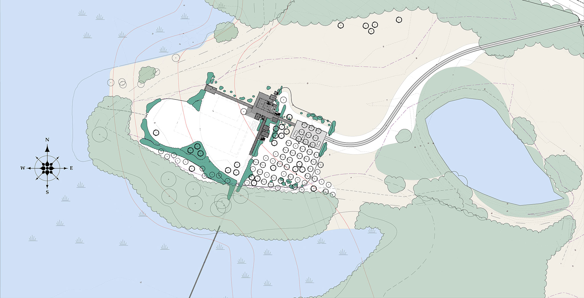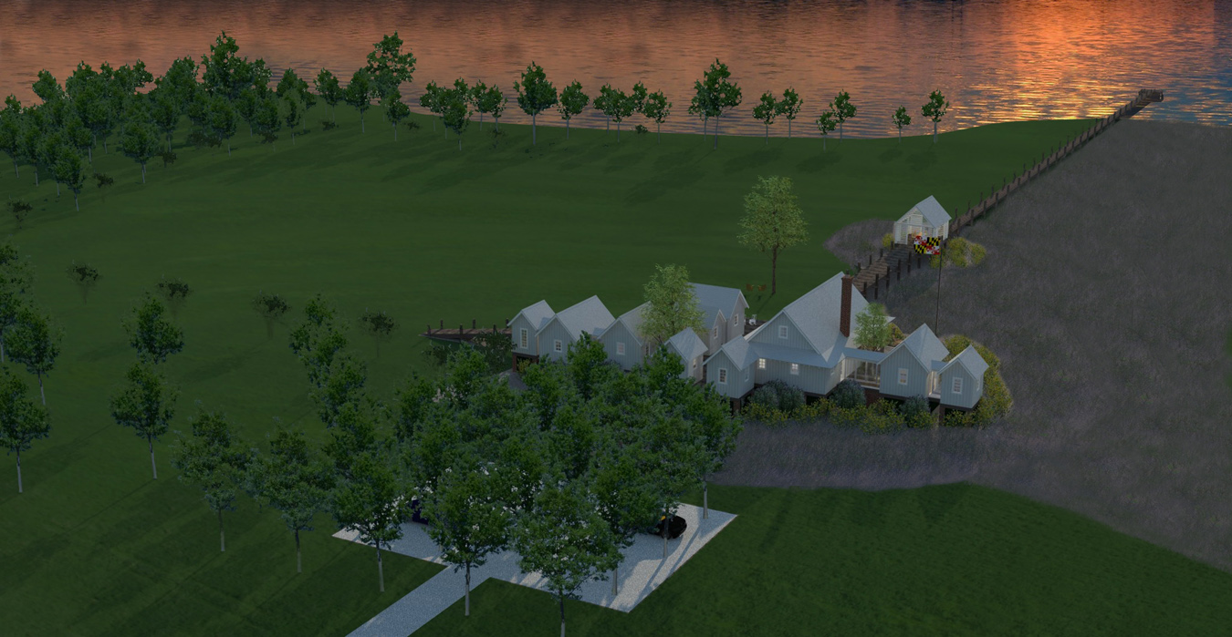 Sited on 122 acres adjacent to Rock Hall, Maryland, an historic tobacco port and fishing center, this private summer retreat enjoys unimpeded panoramic Westerly views twenty miles across the Chesapeake Bay to the skyline of Baltimore. Because of the long “fetch” across the Bay and the increasing potential for strong wave action onto the low-lying ground, the entire house is raised well above the current 100-year flood elevation. Inspired by the vernacular working buildings and boat sheds of watermen found in Rock Hall and around the Chesapeake Bay in such places as Smith and Tangier Islands, this contemporary house was composed to recall the casual arrangement of a village of traditional water dependent structures all connected by elevated boardwalks and piers.