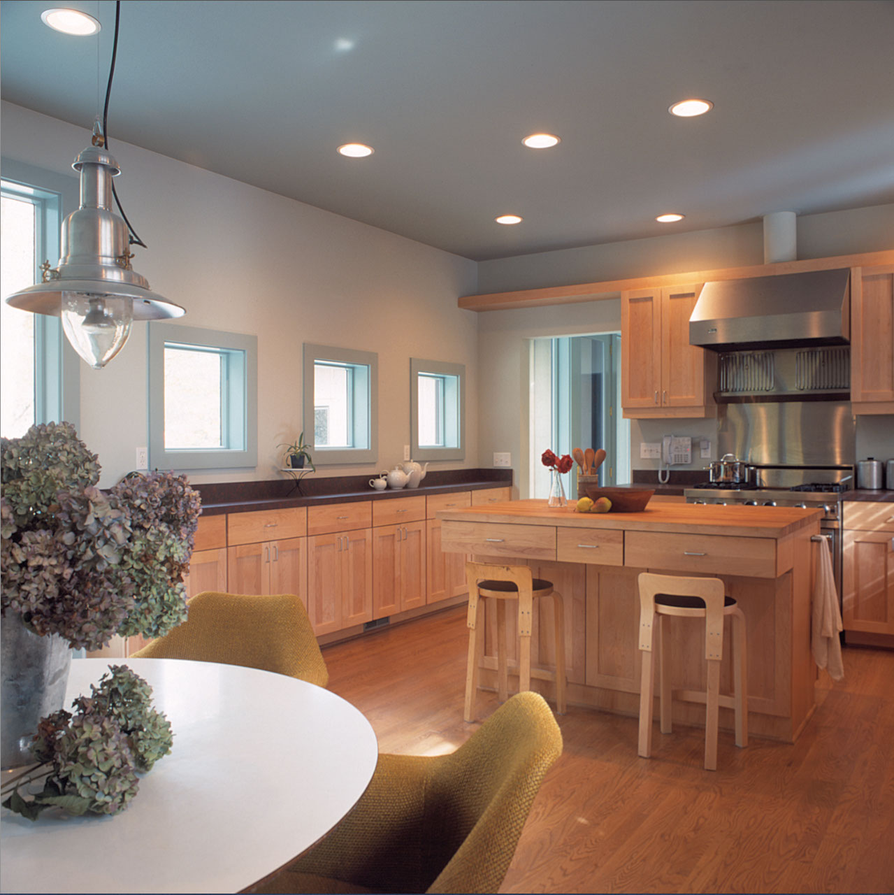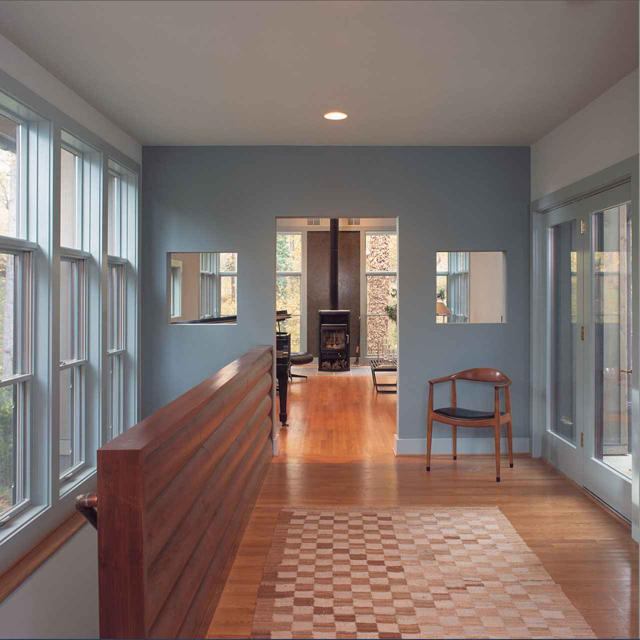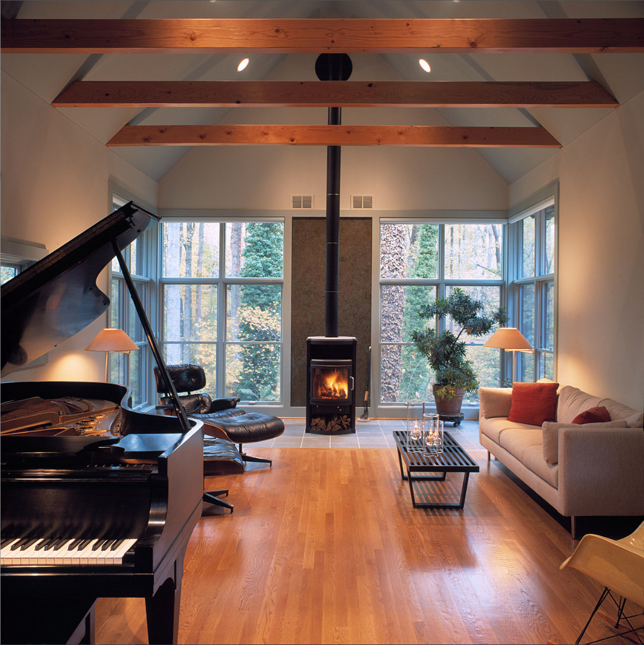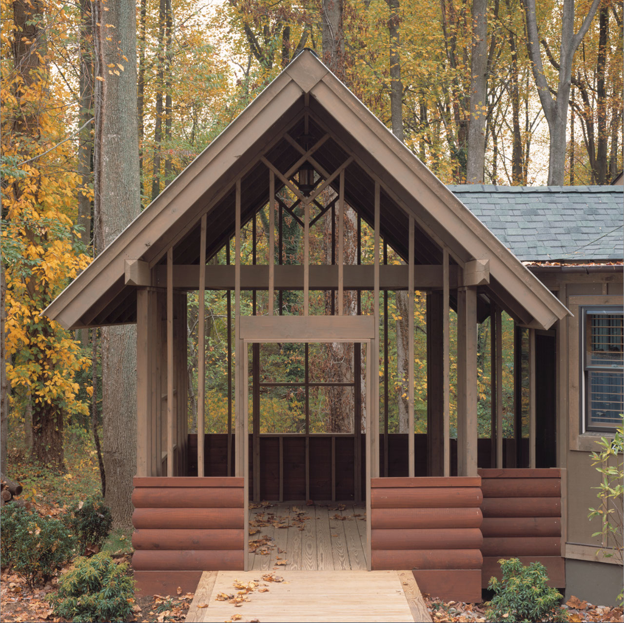 Established as a summer colony of Washington scientists, Scientists Cliffs, overlooking Chesapeake Bay, developed as iconic, 600 square foot, log cabins, many of which were originally constructed of solid chestnut logs. Clad in a combination of log slab and vertical board-and-batten siding, this new residence demonstrates that current living patterns and the desire for significantly larger houses can be accommodated within architectural forms that are compatible in scale, proportion, and materials that appropriately reinforce the original architectural forms and history of Scientists Cliffs.