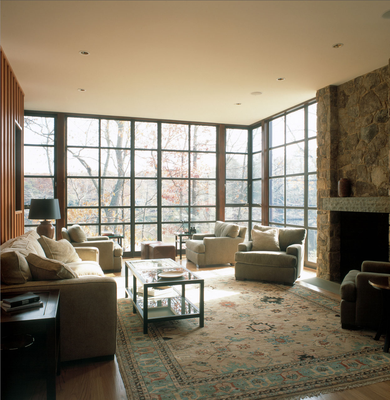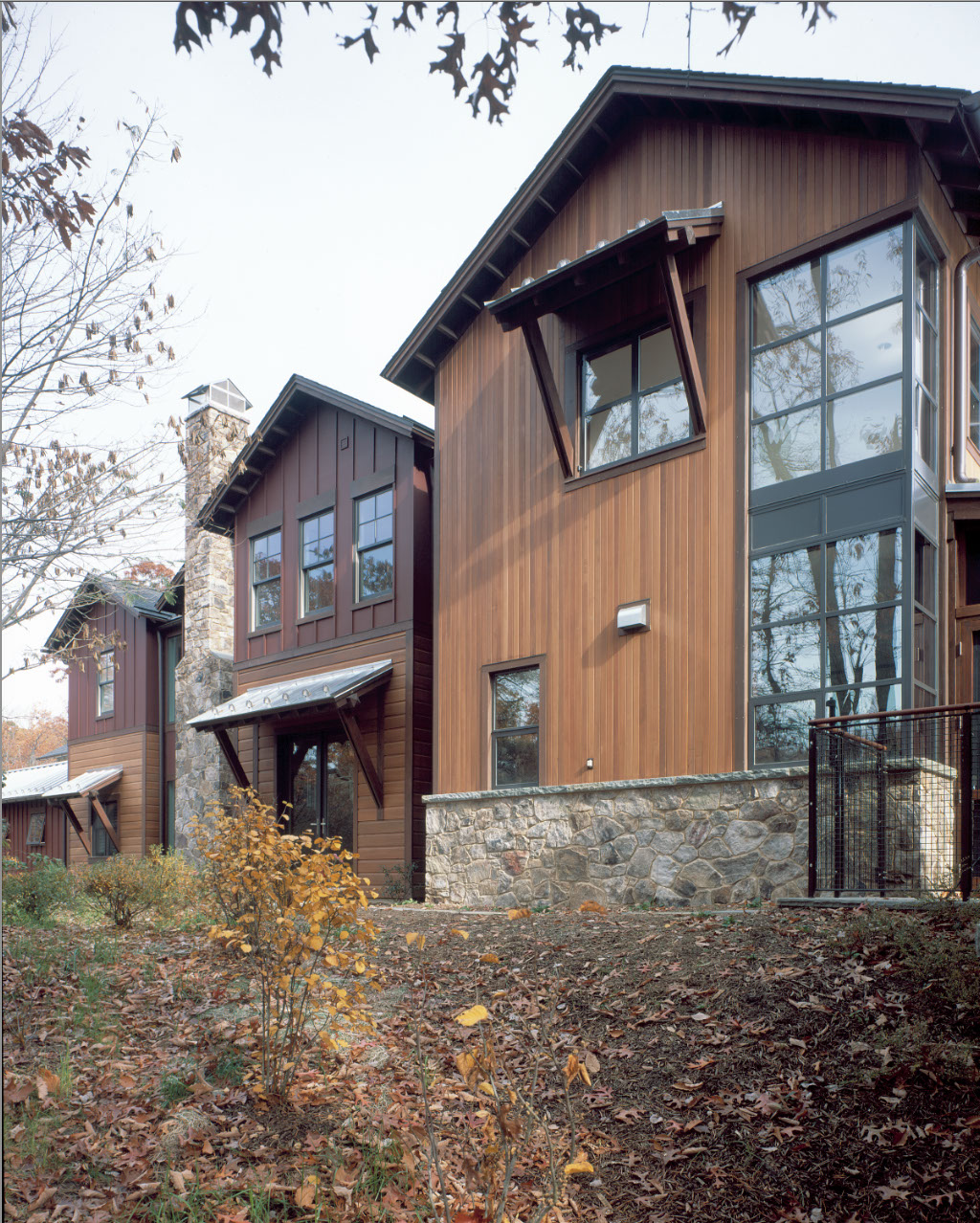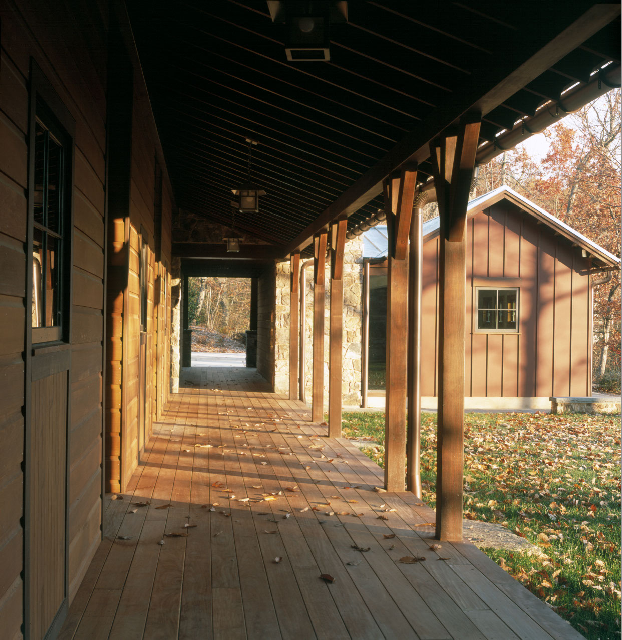 Sited on a very slender ridge surrounded by Valentine Creek near Annapolis, Maryland, this new house was designed as a small village of rustic wood, stone, and glass structures. Entering through a narrow “dogtrot” between two small carriage houses, one emerges onto a light-washed boardwalk with a grass courtyard and a controlled glimpse of the water beyond. The entry foyer continues the choreographed unveiling of water views within the house, while the main living room with its floor-to-ceiling steel windows opens up to reveal the primary panoramic water views.