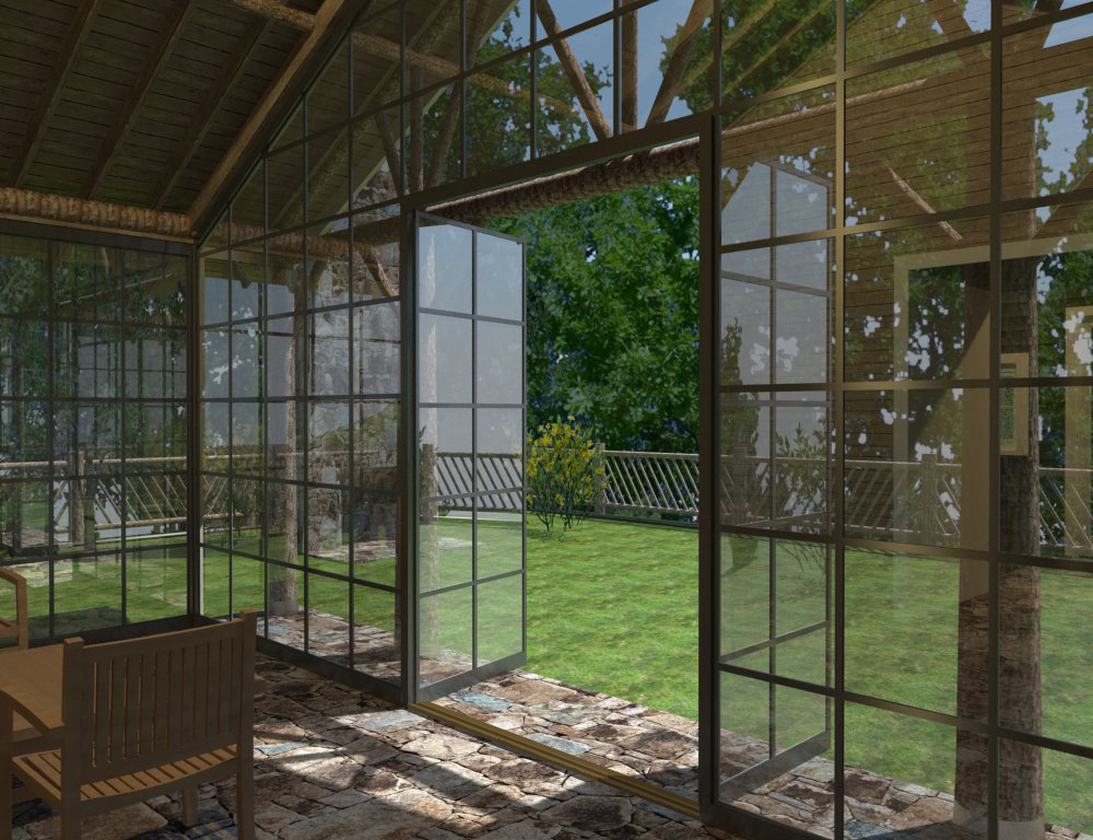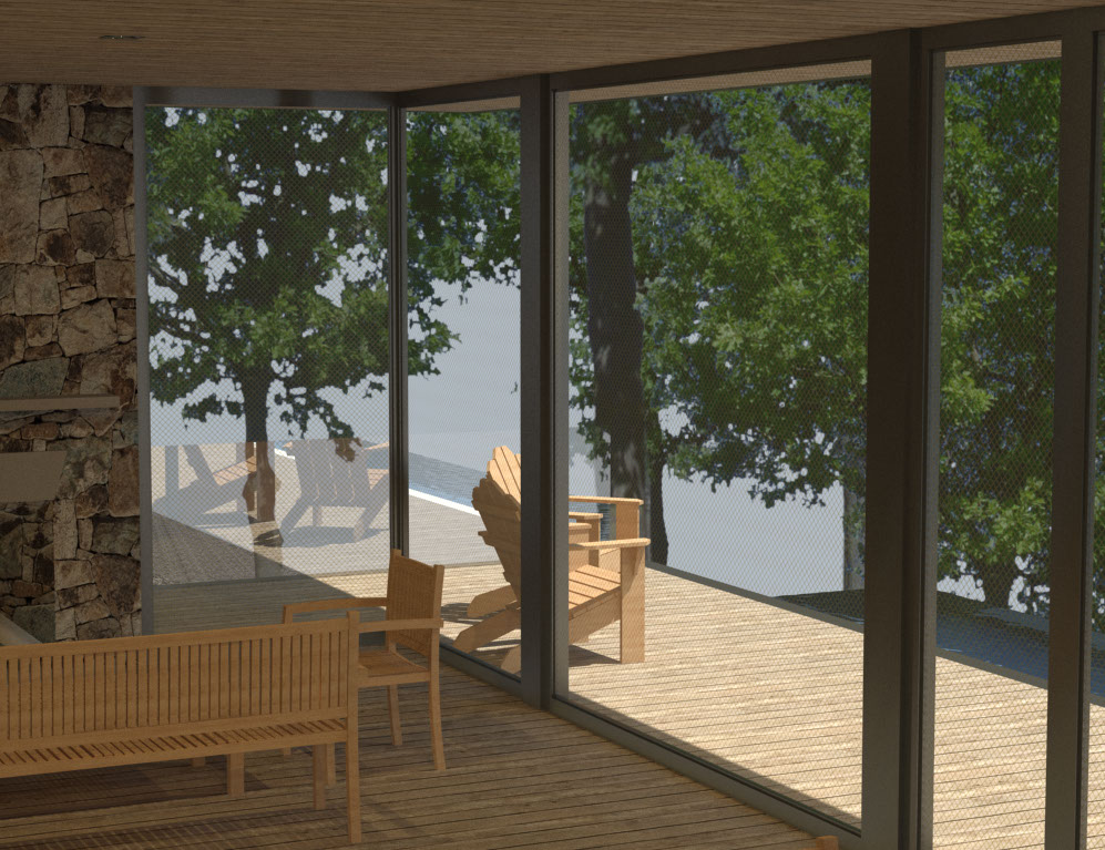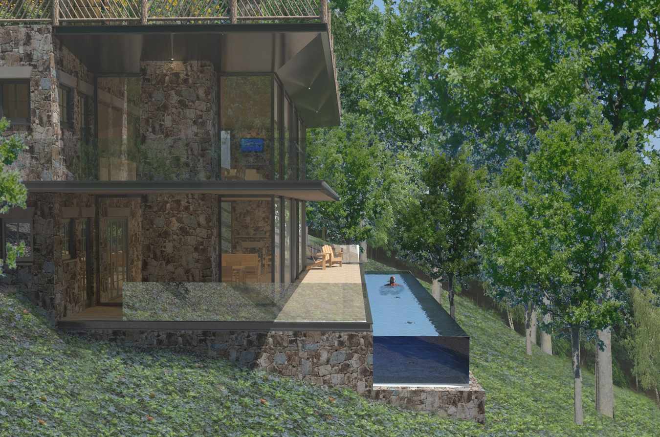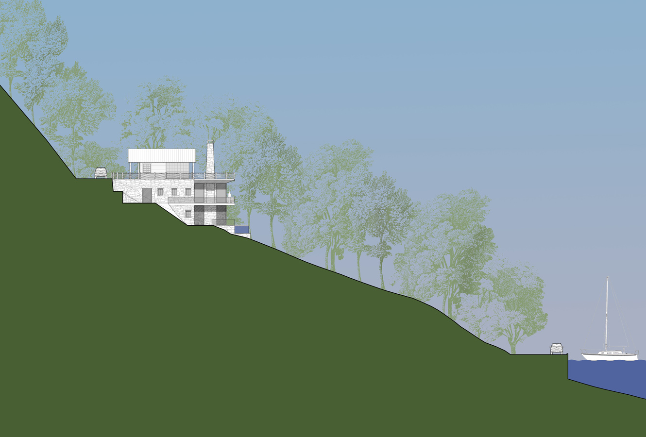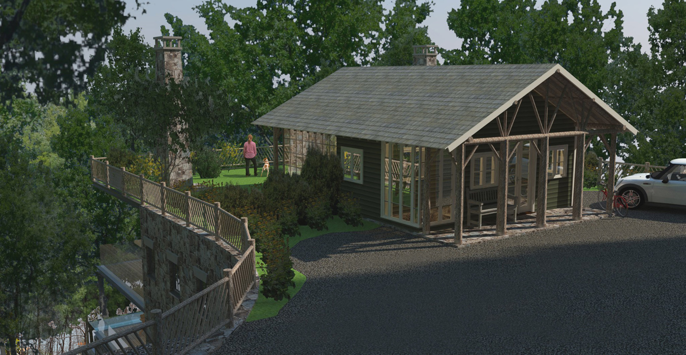 This project is located in a century-old community established as a summer retreat. Original cottages, averaging only 750 SF, were designed in the picturesque Adirondack rustic style employing green, horizontal siding, rustic locust post porches, railings and architectural ornament – all prescribed by design covenant. The design solution sinks the bulk of the new house into the steep grade under a green roof. From the approach, all that is visible is a small, iconic, pavilion about the size of an original cottage functioning as entrance to the house below and as a garden pavilion overlooking the landscaped green roof and river views. Overall the design incorporates the latest developments in energy efficient design.