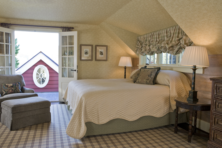 In its previous life, the “Gamekeeper’s Cottage‚ was a deteriorating, non-descript, functional, appendage to the Mayor’s House, a romantic 1740′s log cabin. As part of the renovation to bring the appendage into use as a viable guest suite for the Inn at Little Washington, Good Architecture devised the concept of adding the folly of an outdoor dining pavilion serving double-duty as an elegant, protected, approach and entrance as well as a place to enjoy meals in privacy while gazing out at the pristine view of the Blue Ridge Mountains. Chef Patrick O’Connell reports that “the ‘appendage’ has taken on a new life” and Guests tell him that “they feel as if they are on safari as they watch the deer come to eat the apples from the trees all around.” The sense of serenity and closeness to nature extends to the interiors as well. Designed in an “elegant rusticity” with wood paneling, a new stone fireplace, and loft bedroom with a second bath, the cottage feels like an adult’s fantasy of a tree house.