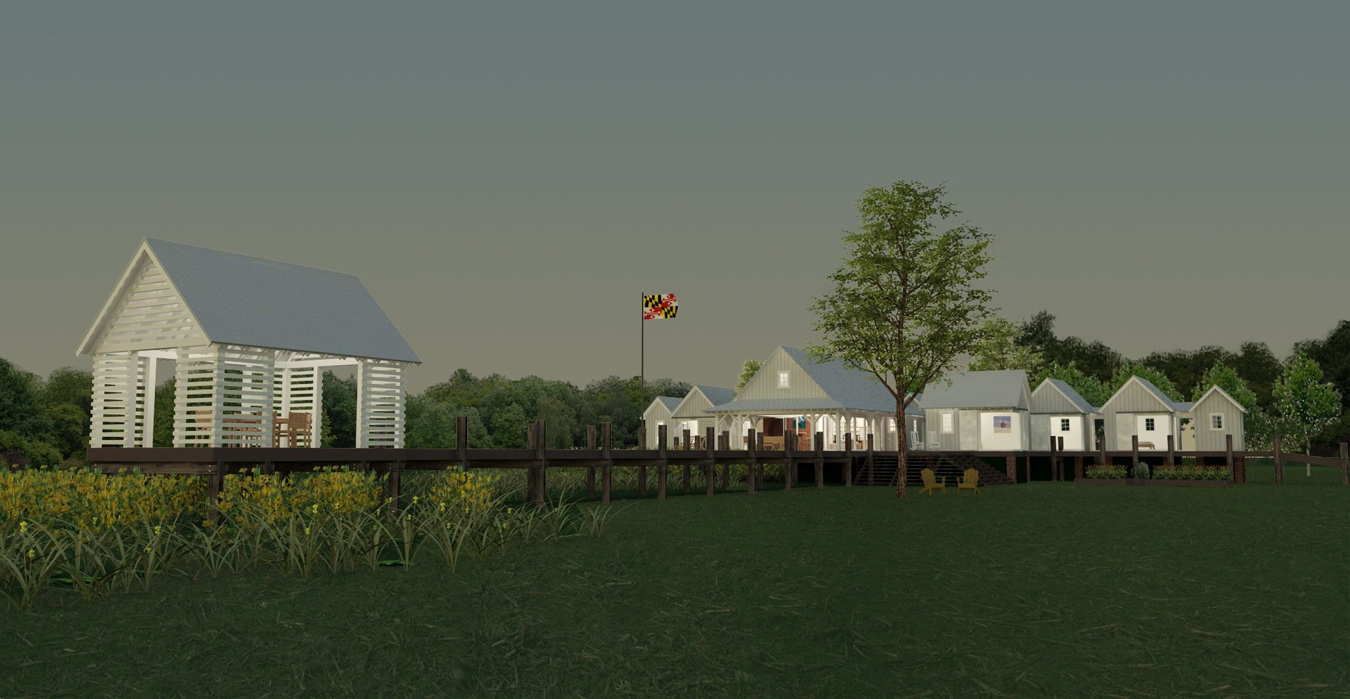 Sited on 122 acres adjacent to Rock Hall, Maryland, an historic tobacco port and fishing center, this private summer retreat enjoys unimpeded panoramic Westerly views twenty miles across the Chesapeake Bay to the skyline of Baltimore. Because of the long “fetch” across the Bay and the increasing potential for strong wave action onto the low-lying ground, the entire house is raised well above the current 100-year flood elevation. Inspired by the vernacular working buildings and boat sheds of watermen found in Rock Hall and around the Chesapeake Bay in such places as Smith and Tangier Islands, this contemporary house was composed to recall the casual arrangement of a village of traditional water dependent structures all connected by elevated boardwalks and piers.